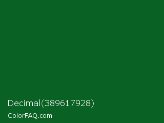 Decimal 389617928 Color is a very dark green color and the nearest color is Camarone #00581a. Hex code #096124 and RGB value is rgb(9,97,36). In RGB color space, this color is composed of 4% red, 38% green, 14% blue, In CMYK color space, this color is composed of 91% cyan, 0% magenta, 63% yellow , 62% black , In HSL color space, this color has a hue angle of 138° , 83% saturation and 21% lightness.