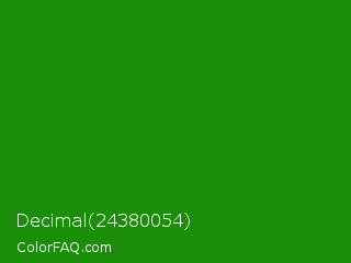 Decimal 24380054 Color is a dark green color and the nearest color is India Green #138808. Hex code #1a8e08 and RGB value is rgb(26,142,8). In RGB color space, this color is composed of 10% red, 56% green, 3% blue, In CMYK color space, this color is composed of 82% cyan, 0% magenta, 94% yellow , 44% black , In HSL color space, this color has a hue angle of 112° , 89% saturation and 29% lightness.