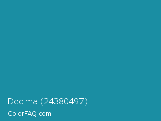 Decimal 24380497 Color is a normal cyan color and the nearest color is Eastern Blue #1e9ab0. Hex code #1a8ea3 and RGB value is rgb(26,142,163). In RGB color space, this color is composed of 10% red, 56% green, 64% blue, In CMYK color space, this color is composed of 84% cyan, 13% magenta, 0% yellow , 36% black , In HSL color space, this color has a hue angle of 189° , 72% saturation and 37% lightness.