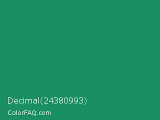 Decimal 24380993 Color is a normal green color and the nearest color is Eucalyptus #278a5b. Hex code #1a8f61 and RGB value is rgb(26,143,97). In RGB color space, this color is composed of 10% red, 56% green, 38% blue, In CMYK color space, this color is composed of 82% cyan, 0% magenta, 32% yellow , 44% black , In HSL color space, this color has a hue angle of 156° , 69% saturation and 33% lightness.