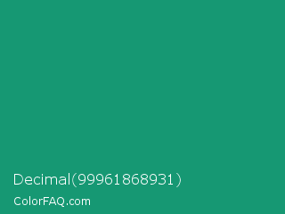 Decimal 99961868931 Color is a normal green color and the nearest color is Green Crayola #1cac78. Hex code #169873 and RGB value is rgb(22,152,115). In RGB color space, this color is composed of 9% red, 60% green, 45% blue, In CMYK color space, this color is composed of 86% cyan, 0% magenta, 24% yellow , 40% black , In HSL color space, this color has a hue angle of 163° , 75% saturation and 34% lightness.