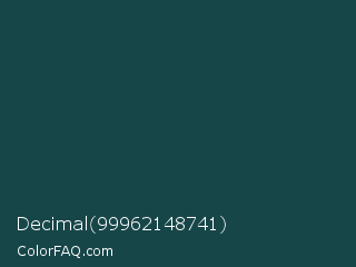 Decimal 99962148741 Color is a very dark cyan color and the nearest color is Blue Dianne #204852. Hex code #174649 and RGB value is rgb(23,70,73). In RGB color space, this color is composed of 9% red, 27% green, 29% blue, In CMYK color space, this color is composed of 68% cyan, 4% magenta, 0% yellow , 71% black , In HSL color space, this color has a hue angle of 184° , 52% saturation and 19% lightness.