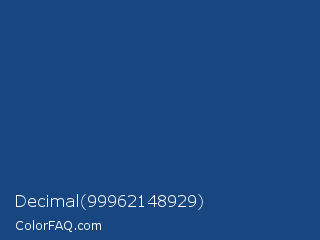 Decimal 99962148929 Color is a dark blue color and the nearest color is Dark Cerulean #08457e. Hex code #174681 and RGB value is rgb(23,70,129). In RGB color space, this color is composed of 9% red, 27% green, 51% blue, In CMYK color space, this color is composed of 82% cyan, 46% magenta, 0% yellow , 49% black , In HSL color space, this color has a hue angle of 213° , 70% saturation and 30% lightness.