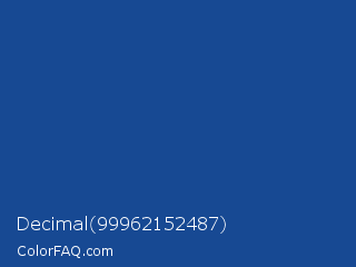 Decimal 99962152487 Color is a normal blue color and the nearest color is Yale Blue #0f4d92. Hex code #174993 and RGB value is rgb(23,73,147). In RGB color space, this color is composed of 9% red, 29% green, 58% blue, In CMYK color space, this color is composed of 84% cyan, 50% magenta, 0% yellow , 42% black , In HSL color space, this color has a hue angle of 216° , 73% saturation and 33% lightness.
