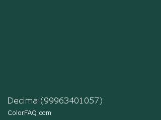 Decimal 99963401057 Color is a very dark cyan color and the nearest color is Brunswick Green #1b4d3e. Hex code #194841 and RGB value is rgb(25,72,65). In RGB color space, this color is composed of 10% red, 28% green, 25% blue, In CMYK color space, this color is composed of 65% cyan, 0% magenta, 10% yellow , 72% black , In HSL color space, this color has a hue angle of 171° , 48% saturation and 19% lightness.