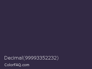 Decimal 99993352232 Color is a very dark indigo color and the nearest color is Blackcurrant #32293a. Hex code #322944 and RGB value is rgb(50,41,68). In RGB color space, this color is composed of 20% red, 16% green, 27% blue, In CMYK color space, this color is composed of 26% cyan, 40% magenta, 0% yellow , 73% black , In HSL color space, this color has a hue angle of 260° , 25% saturation and 21% lightness.