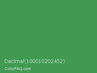 Decimal 100010202452 Color is a normal green color and the nearest color is Fruit Salad #4f9d5d. Hex code #419952 and RGB value is rgb(65,153,82). In RGB color space, this color is composed of 25% red, 60% green, 32% blue, In CMYK color space, this color is composed of 58% cyan, 0% magenta, 46% yellow , 40% black , In HSL color space, this color has a hue angle of 132° , 40% saturation and 43% lightness.