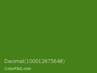 Decimal 100012675648 Color is a dark green color and the nearest color is La Palma #368716. Hex code #458018 and RGB value is rgb(69,128,24). In RGB color space, this color is composed of 27% red, 50% green, 9% blue, In CMYK color space, this color is composed of 46% cyan, 0% magenta, 81% yellow , 50% black , In HSL color space, this color has a hue angle of 94° , 68% saturation and 30% lightness.