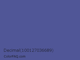 Decimal 100127036689 Color is a normal blue color and the nearest color is Liberty #545aa7. Hex code #505697 and RGB value is rgb(80,86,151). In RGB color space, this color is composed of 31% red, 34% green, 59% blue, In CMYK color space, this color is composed of 47% cyan, 43% magenta, 0% yellow , 41% black , In HSL color space, this color has a hue angle of 235° , 31% saturation and 45% lightness.