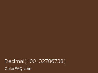 Decimal 100132786738 Color is a dark orange color and the nearest color is Irish Coffee #5f3d26. Hex code #583520 and RGB value is rgb(88,53,32). In RGB color space, this color is composed of 35% red, 21% green, 13% blue, In CMYK color space, this color is composed of 0% cyan, 40% magenta, 64% yellow , 65% black , In HSL color space, this color has a hue angle of 23° , 47% saturation and 24% lightness.