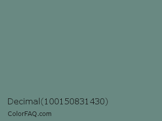 Decimal 100150831430 Color is a normal cyan color and the nearest color is Blue Smoke #748881. Hex code #698982 and RGB value is rgb(105,137,130). In RGB color space, this color is composed of 41% red, 54% green, 51% blue, In CMYK color space, this color is composed of 23% cyan, 0% magenta, 5% yellow , 46% black , In HSL color space, this color has a hue angle of 167° , 13% saturation and 47% lightness.