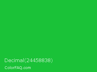 Decimal 24458838 Color is a normal green color and the nearest color is Dark Pastel Green #03c03c. Hex code #1ac238 and RGB value is rgb(26,194,56). In RGB color space, this color is composed of 10% red, 76% green, 22% blue, In CMYK color space, this color is composed of 87% cyan, 0% magenta, 71% yellow , 24% black , In HSL color space, this color has a hue angle of 131° , 76% saturation and 43% lightness.