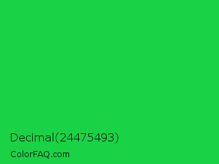 Decimal 24475493 Color is a normal green color and the nearest color is Malachite #0bda51. Hex code #1ad245 and RGB value is rgb(26,210,69). In RGB color space, this color is composed of 10% red, 82% green, 27% blue, In CMYK color space, this color is composed of 88% cyan, 0% magenta, 67% yellow , 18% black , In HSL color space, this color has a hue angle of 134° , 78% saturation and 46% lightness.