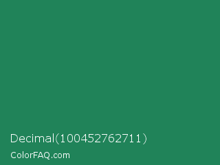 Decimal 100452762711 Color is a normal green color and the nearest color is Eucalyptus #278a5b. Hex code #208359 and RGB value is rgb(32,131,89). In RGB color space, this color is composed of 13% red, 51% green, 35% blue, In CMYK color space, this color is composed of 76% cyan, 0% magenta, 32% yellow , 49% black , In HSL color space, this color has a hue angle of 155° , 61% saturation and 32% lightness.