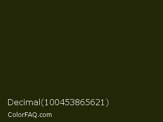 Decimal 100453865621 Color is a almost black yellow color and the nearest color is Deep Forest Green #182d09. Hex code #222707 and RGB value is rgb(34,39,7). In RGB color space, this color is composed of 13% red, 15% green, 3% blue, In CMYK color space, this color is composed of 13% cyan, 0% magenta, 82% yellow , 85% black , In HSL color space, this color has a hue angle of 69° , 70% saturation and 9% lightness.