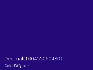 Decimal 100455060480 Color is a dark indigo color and the nearest color is Deep Blue #220878. Hex code #240978 and RGB value is rgb(36,9,120). In RGB color space, this color is composed of 14% red, 4% green, 47% blue, In CMYK color space, this color is composed of 70% cyan, 93% magenta, 0% yellow , 53% black , In HSL color space, this color has a hue angle of 255° , 86% saturation and 25% lightness.