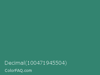 Decimal 100471945504 Color is a normal cyan color and the nearest color is Myrtle Green #317873. Hex code #338470 and RGB value is rgb(51,132,112). In RGB color space, this color is composed of 20% red, 52% green, 44% blue, In CMYK color space, this color is composed of 61% cyan, 0% magenta, 15% yellow , 48% black , In HSL color space, this color has a hue angle of 165° , 44% saturation and 36% lightness.