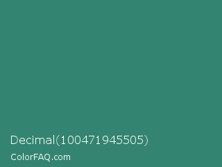 Decimal 100471945505 Color is a normal cyan color and the nearest color is Celadon Green #2f847c. Hex code #338471 and RGB value is rgb(51,132,113). In RGB color space, this color is composed of 20% red, 52% green, 44% blue, In CMYK color space, this color is composed of 61% cyan, 0% magenta, 14% yellow , 48% black , In HSL color space, this color has a hue angle of 166° , 44% saturation and 36% lightness.