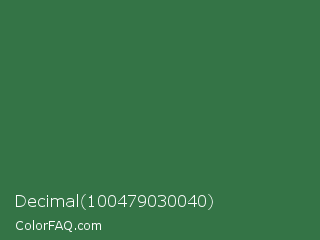 Decimal 100479030040 Color is a normal green color and the nearest color is Killarney #3a6a47. Hex code #347446 and RGB value is rgb(52,116,70). In RGB color space, this color is composed of 20% red, 45% green, 27% blue, In CMYK color space, this color is composed of 55% cyan, 0% magenta, 40% yellow , 55% black , In HSL color space, this color has a hue angle of 137° , 38% saturation and 33% lightness.