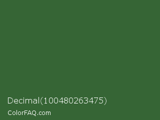 Decimal 100480263475 Color is a dark green color and the nearest color is Mughal Green #306030. Hex code #366535 and RGB value is rgb(54,101,53). In RGB color space, this color is composed of 21% red, 40% green, 21% blue, In CMYK color space, this color is composed of 47% cyan, 0% magenta, 48% yellow , 60% black , In HSL color space, this color has a hue angle of 119° , 31% saturation and 30% lightness.