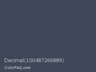 Decimal 100487266889 Color is a dark blue color and the nearest color is Gun Powder #414257. Hex code #404759 and RGB value is rgb(64,71,89). In RGB color space, this color is composed of 25% red, 28% green, 35% blue, In CMYK color space, this color is composed of 28% cyan, 20% magenta, 0% yellow , 65% black , In HSL color space, this color has a hue angle of 223° , 16% saturation and 30% lightness.