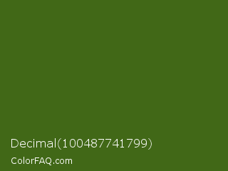 Decimal 100487741799 Color is a dark green color and the nearest color is Dell #396413. Hex code #416817 and RGB value is rgb(65,104,23). In RGB color space, this color is composed of 25% red, 41% green, 9% blue, In CMYK color space, this color is composed of 38% cyan, 0% magenta, 78% yellow , 59% black , In HSL color space, this color has a hue angle of 89° , 64% saturation and 25% lightness.