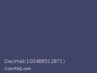 Decimal 100488512871 Color is a normal blue color and the nearest color is Mulled Wine #4e4562. Hex code #424467 and RGB value is rgb(66,68,103). In RGB color space, this color is composed of 26% red, 27% green, 40% blue, In CMYK color space, this color is composed of 36% cyan, 34% magenta, 0% yellow , 60% black , In HSL color space, this color has a hue angle of 237° , 22% saturation and 33% lightness.