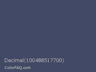 Decimal 100488517700 Color is a normal blue color and the nearest color is Fiord #405169. Hex code #424964 and RGB value is rgb(66,73,100). In RGB color space, this color is composed of 26% red, 29% green, 39% blue, In CMYK color space, this color is composed of 34% cyan, 27% magenta, 0% yellow , 61% black , In HSL color space, this color has a hue angle of 228° , 20% saturation and 33% lightness.