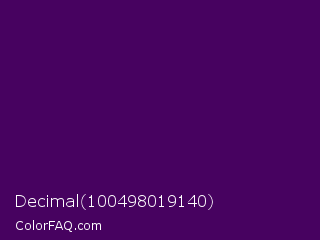 Decimal 100498019140 Color is a very dark purple color and the nearest color is Clairvoyant #480656. Hex code #470260 and RGB value is rgb(71,2,96). In RGB color space, this color is composed of 28% red, 1% green, 38% blue, In CMYK color space, this color is composed of 26% cyan, 98% magenta, 0% yellow , 62% black , In HSL color space, this color has a hue angle of 284° , 96% saturation and 19% lightness.