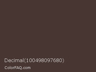 Decimal 100498097680 Color is a dark red color and the nearest color is Woody Brown #483131. Hex code #473632 and RGB value is rgb(71,54,50). In RGB color space, this color is composed of 28% red, 21% green, 20% blue, In CMYK color space, this color is composed of 0% cyan, 24% magenta, 30% yellow , 72% black , In HSL color space, this color has a hue angle of 11° , 17% saturation and 24% lightness.
