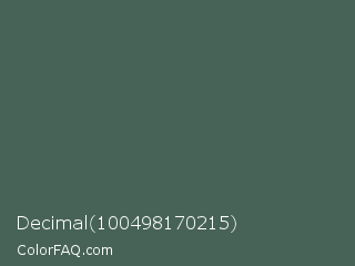 Decimal 100498170215 Color is a normal green color and the nearest color is Nandor #4b5d52. Hex code #476357 and RGB value is rgb(71,99,87). In RGB color space, this color is composed of 28% red, 39% green, 34% blue, In CMYK color space, this color is composed of 28% cyan, 0% magenta, 12% yellow , 61% black , In HSL color space, this color has a hue angle of 154° , 16% saturation and 33% lightness.