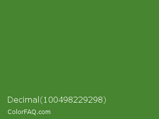 Decimal 100498229298 Color is a normal green color and the nearest color is Sap Green #507d2a. Hex code #478530 and RGB value is rgb(71,133,48). In RGB color space, this color is composed of 28% red, 52% green, 19% blue, In CMYK color space, this color is composed of 47% cyan, 0% magenta, 64% yellow , 48% black , In HSL color space, this color has a hue angle of 104° , 47% saturation and 35% lightness.