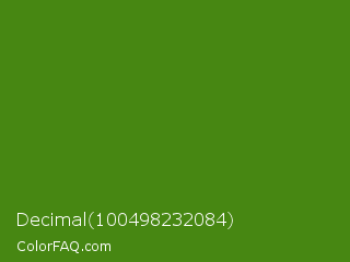 Decimal 100498232084 Color is a dark green color and the nearest color is Vida Loca #549019. Hex code #478712 and RGB value is rgb(71,135,18). In RGB color space, this color is composed of 28% red, 53% green, 7% blue, In CMYK color space, this color is composed of 47% cyan, 0% magenta, 87% yellow , 47% black , In HSL color space, this color has a hue angle of 93° , 76% saturation and 30% lightness.