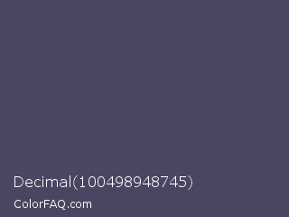 Decimal 100498948745 Color is a normal indigo color and the nearest color is Mulled Wine #4e4562. Hex code #484661 and RGB value is rgb(72,70,97). In RGB color space, this color is composed of 28% red, 27% green, 38% blue, In CMYK color space, this color is composed of 26% cyan, 28% magenta, 0% yellow , 62% black , In HSL color space, this color has a hue angle of 244° , 16% saturation and 33% lightness.
