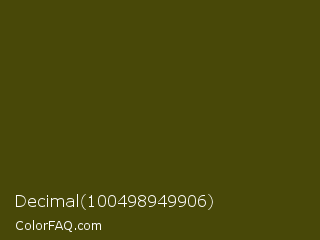 Decimal 100498949906 Color is a very dark yellow color and the nearest color is Bronze Olive #4e420c. Hex code #484808 and RGB value is rgb(72,72,8). In RGB color space, this color is composed of 28% red, 28% green, 3% blue, In CMYK color space, this color is composed of 0% cyan, 0% magenta, 89% yellow , 72% black , In HSL color space, this color has a hue angle of 60° , 80% saturation and 16% lightness.