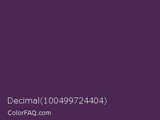Decimal 100499724404 Color is a dark purple color and the nearest color is Bossanova #4e2a5a. Hex code #492752 and RGB value is rgb(73,39,82). In RGB color space, this color is composed of 29% red, 15% green, 32% blue, In CMYK color space, this color is composed of 11% cyan, 52% magenta, 0% yellow , 68% black , In HSL color space, this color has a hue angle of 287° , 36% saturation and 24% lightness.