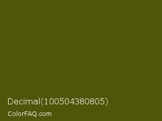 Decimal 100504380805 Color is a very dark yellow color and the nearest color is Saratoga #555b10. Hex code #505609 and RGB value is rgb(80,86,9). In RGB color space, this color is composed of 31% red, 34% green, 4% blue, In CMYK color space, this color is composed of 7% cyan, 0% magenta, 90% yellow , 66% black , In HSL color space, this color has a hue angle of 65° , 81% saturation and 19% lightness.