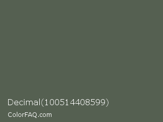 Decimal 100514408599 Color is a normal green color and the nearest color is Ebony #555d50. Hex code #556051 and RGB value is rgb(85,96,81). In RGB color space, this color is composed of 33% red, 38% green, 32% blue, In CMYK color space, this color is composed of 11% cyan, 0% magenta, 16% yellow , 62% black , In HSL color space, this color has a hue angle of 104° , 8% saturation and 35% lightness.