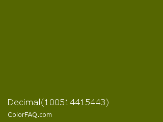 Decimal 100514415443 Color is a very dark yellow color and the nearest color is Saratoga #555b10. Hex code #556601 and RGB value is rgb(85,102,1). In RGB color space, this color is composed of 33% red, 40% green, 0% blue, In CMYK color space, this color is composed of 17% cyan, 0% magenta, 99% yellow , 60% black , In HSL color space, this color has a hue angle of 70° , 98% saturation and 20% lightness.