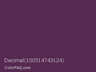 Decimal 100514743124 Color is a dark magenta color and the nearest color is Japanese Violet #5b3256. Hex code #562952 and RGB value is rgb(86,41,82). In RGB color space, this color is composed of 34% red, 16% green, 32% blue, In CMYK color space, this color is composed of 0% cyan, 52% magenta, 5% yellow , 66% black , In HSL color space, this color has a hue angle of 305° , 35% saturation and 25% lightness.