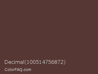 Decimal 100514756872 Color is a dark red color and the nearest color is Congo Brown #593737. Hex code #563734 and RGB value is rgb(86,55,52). In RGB color space, this color is composed of 34% red, 22% green, 20% blue, In CMYK color space, this color is composed of 0% cyan, 36% magenta, 40% yellow , 66% black , In HSL color space, this color has a hue angle of 5° , 25% saturation and 27% lightness.