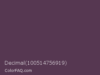 Decimal 100514756919 Color is a dark magenta color and the nearest color is Voodoo #533455. Hex code #563751 and RGB value is rgb(86,55,81). In RGB color space, this color is composed of 34% red, 22% green, 32% blue, In CMYK color space, this color is composed of 0% cyan, 36% magenta, 6% yellow , 66% black , In HSL color space, this color has a hue angle of 310° , 22% saturation and 28% lightness.