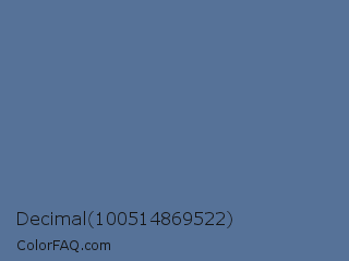 Decimal 100514869522 Color is a normal blue color and the nearest color is Kashmir Blue #507096. Hex code #567298 and RGB value is rgb(86,114,152). In RGB color space, this color is composed of 34% red, 45% green, 60% blue, In CMYK color space, this color is composed of 43% cyan, 25% magenta, 0% yellow , 40% black , In HSL color space, this color has a hue angle of 215° , 28% saturation and 47% lightness.
