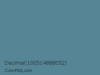 Decimal 100514888052 Color is a normal blue color and the nearest color is Smalt Blue #51808f. Hex code #568596 and RGB value is rgb(86,133,150). In RGB color space, this color is composed of 34% red, 52% green, 59% blue, In CMYK color space, this color is composed of 43% cyan, 11% magenta, 0% yellow , 41% black , In HSL color space, this color has a hue angle of 196° , 27% saturation and 46% lightness.