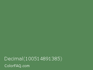 Decimal 100514891385 Color is a normal green color and the nearest color is Middle Green #4d8c57. Hex code #568857 and RGB value is rgb(86,136,87). In RGB color space, this color is composed of 34% red, 53% green, 34% blue, In CMYK color space, this color is composed of 37% cyan, 0% magenta, 36% yellow , 47% black , In HSL color space, this color has a hue angle of 121° , 23% saturation and 44% lightness.