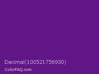Decimal 100521756930 Color is a normal purple color and the nearest color is Seance #731e8f. Hex code #601686 and RGB value is rgb(96,22,134). In RGB color space, this color is composed of 38% red, 9% green, 53% blue, In CMYK color space, this color is composed of 28% cyan, 84% magenta, 0% yellow , 47% black , In HSL color space, this color has a hue angle of 280° , 72% saturation and 31% lightness.