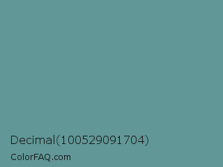 Decimal 100529091704 Color is a normal cyan color and the nearest color is Desaturated Cyan #669999. Hex code #619796 and RGB value is rgb(97,151,150). In RGB color space, this color is composed of 38% red, 59% green, 59% blue, In CMYK color space, this color is composed of 36% cyan, 0% magenta, 1% yellow , 41% black , In HSL color space, this color has a hue angle of 179° , 22% saturation and 49% lightness.