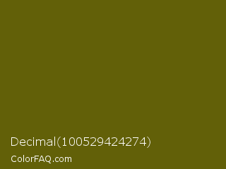 Decimal 100529424274 Color is a very dark yellow color and the nearest color is Saratoga #555b10. Hex code #626008 and RGB value is rgb(98,96,8). In RGB color space, this color is composed of 38% red, 38% green, 3% blue, In CMYK color space, this color is composed of 0% cyan, 2% magenta, 92% yellow , 62% black , In HSL color space, this color has a hue angle of 59° , 85% saturation and 21% lightness.
