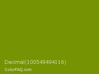 Decimal 100549494116 Color is a dark lime color and the nearest color is Limeade #6f9d02. Hex code #769304 and RGB value is rgb(118,147,4). In RGB color space, this color is composed of 46% red, 58% green, 2% blue, In CMYK color space, this color is composed of 20% cyan, 0% magenta, 97% yellow , 42% black , In HSL color space, this color has a hue angle of 72° , 95% saturation and 30% lightness.