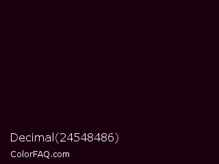 Decimal 24548486 Color is a almost black rose color and the nearest color is Asphalt #130a06. Hex code #1b000e and RGB value is rgb(27,0,14). In RGB color space, this color is composed of 11% red, 0% green, 5% blue, In CMYK color space, this color is composed of 0% cyan, 100% magenta, 48% yellow , 89% black , In HSL color space, this color has a hue angle of 329° , 100% saturation and 5% lightness.